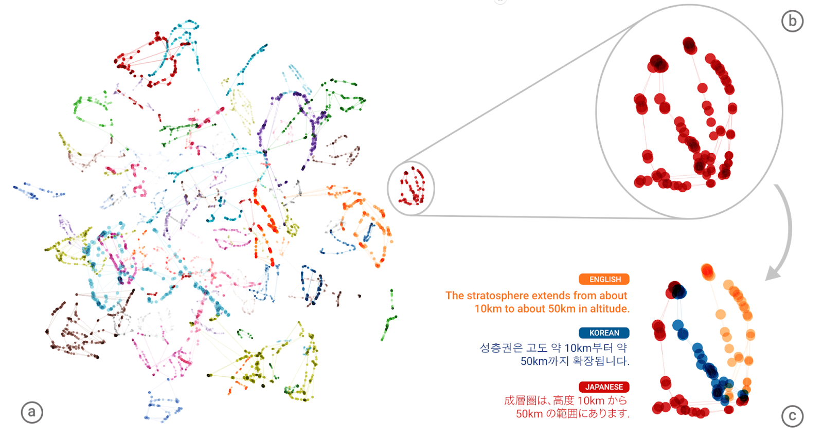 Здесь (а) показана работа нейросети в период перевода между тремя языками: английским, корейским и японским. При этом одним цветом обозначены блоки данных, имеющие общий смысл, то есть, например, хранящие предложение, переводимое с английского на корейский и с японского на английский. А (с) показывает уже внутреннюю структуру одноцветных сочленений: тут для разных языков уже разные цвета. Так вот тот факт, что языковые гроздья сгруппированы, но разделены по языкам, означает, что ИИ научился не просто механически сопоставлять слова и фразы из разных языков, а именно выделять смысл текста и накапливать его.