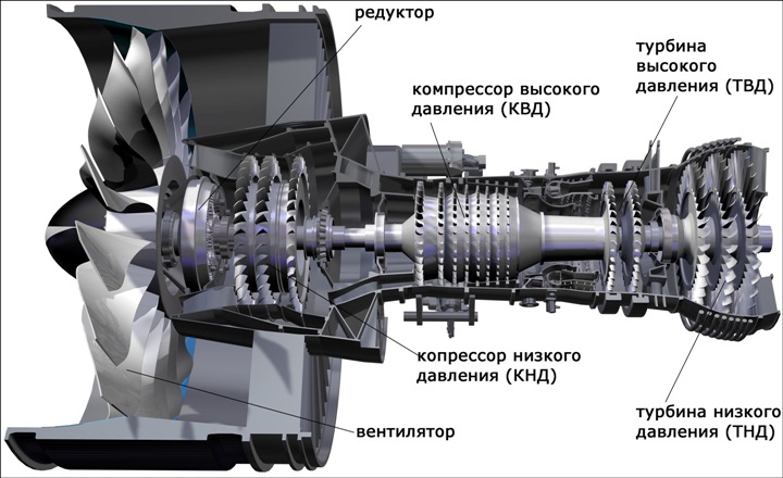 Ну и конечно то, что «вместо сердца». Вошедший в песню индустриальной эпохи «огненный мотор»! Казалось бы, на пассажирских лайнерах стоят те же самые газовые турбины, что и десятилетия назад. Вентиляторы засасывают воздух, сжимают его, в нем сжигают топливо, горячие газы выходят из камеры сгорания, создавая тягу и попутно крутя турбину, приводящую в действие вентиляторы. Вокруг этой схемы вертится все. Ну, иногда на ось – через редукторы – надевались наружные винты. Порой соосные, как на стратегическом бомбардировщике Ту-95, вращающиеся в противоположных направлениях. В этом случае мы имеем дело с турбовинтовым двигателем, ТВД. Он создает на относительно небольших скоростях потока бОльшую тягу при той же мощности турбины.