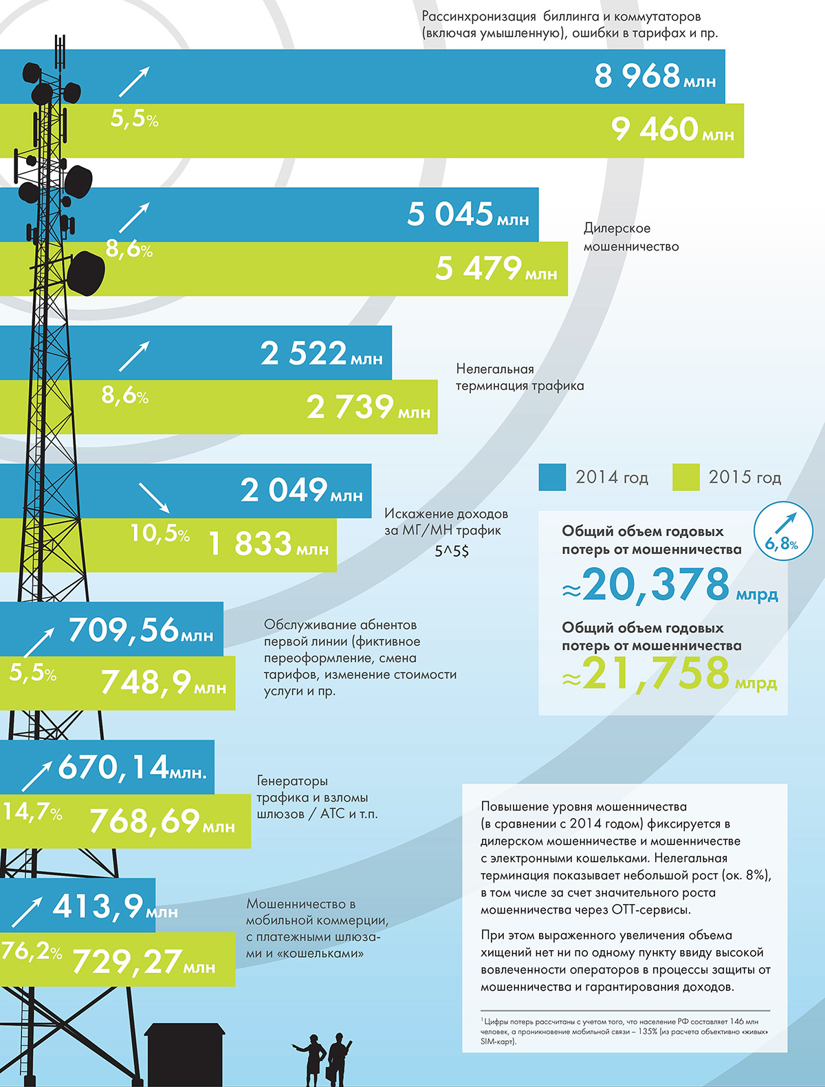 Больше всех в абсолютных цифрах пострадали от различных видов мошенничества телекоммуникационные компании. Рассинхронизация биллинга (в том числе умышленная), нелегальная терминация трафика и другие схемы обмана привели к убыткам на сумму 21,758 млрд рублей. Однако по сравнению с предыдущим годом этот показатель вырос всего на 6,8% – сказывается накопленный опыт борьбы.