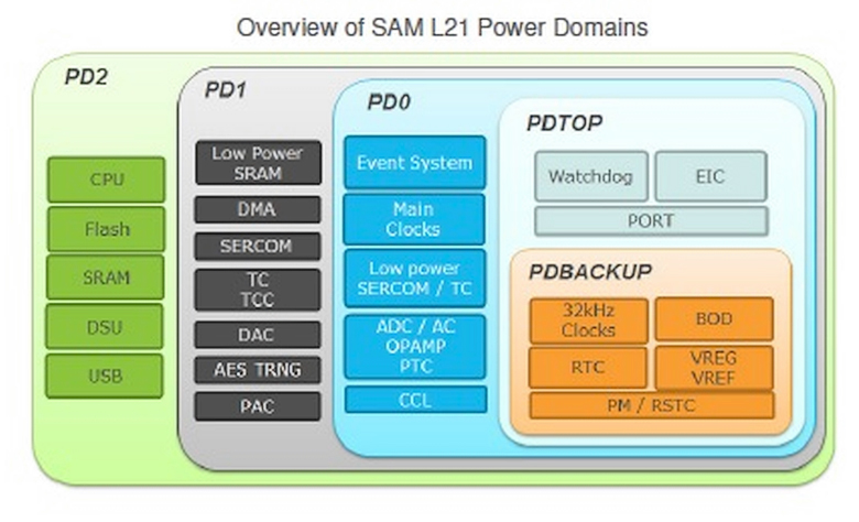 Новые чипы серии SAM L21 на базе ядра ARM Cortex-M0+ работают на частоте до 48 МГц, обеспечивая энергопотребление на уровне 35 мкА / МГц в активном режиме и до 200 нA в состоянии глубокого сна. Менеджер по маркетингу Atmel Андреас Йеланд (Andreas Eieland) пояснил, как удалось достичь таких показателей: «В традиционной реализации режима сна отключаются все блоки контроллера, кроме часов реального времени. Это необходимо для того, чтобы после пробуждения он оставался синхронизирован. В L21 мы полностью изменили схему пониженного энергопотребления. Весь чип разделён на пять доменов, и остаточный ток может забираться от неиспользуемых модулей. К тому же, периферийные устройства продолжают взаимодействовать даже когда контроллер спит».