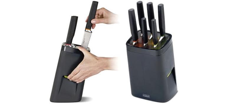 Joseph Joseph сообщают, что блокирующий зажим покрыт прорезиненным слоем, что защити лезвие от деформации и не повредит заточку. Купить LockBlock можно как на сайте производителя, так и во многих магазинах кухонный аксессуаров. Стоимость самой полставки составляет 60 долларов, в комплекте с шестью ножами – 150 долларов.