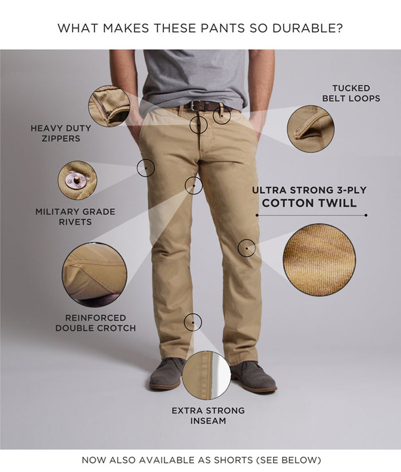 Реппард сетует, что даже спецодежда повышенной прочности быстро изнашивается и заставляет тратить время и деньги на покупку новой и утверждает, что изобрел материал, который выдержит активную носку в течение четверти века. Хитрость заключается в расположении волокон ткани – несколько нитей пряжи скручиваются сразу в двух направлениях, что повышает износостойкость ткани в десятки раз. Кроме того, джинсы Quarter Century Pants скроены так, что самые проблемные и быстро истирающиеся зоны (промежность, внутренняя поверхность бедер, карманы, нижняя кромка) прошиты в несколько слоев. Так же все швы прострочены четыре раза (по два с обеих сторон), а молния и заклепки изготовлены из меди, используемой в одежде военных.