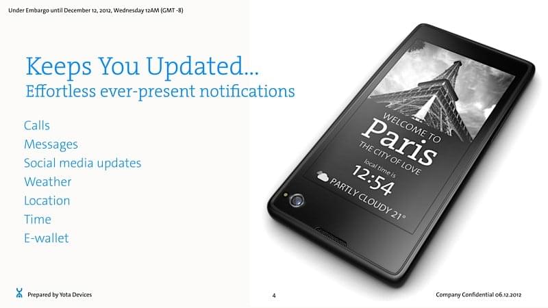 Есть одна большая проблема: современные смартфоны до неприличия мало работают от одного заряда аккумулятора (в случае интенсивного использования, конечно). Почему? Всё дело в дисплее — именно его подсветка «съедает» батарею. Но вот, например, экраны на основе электронных чернил не требуют подсветки, что даёт им большое преимущество перед жидкокристаллическими. Так почему бы не встроить такой экран в смартфон? Именно так и поступили в компании Yota Devices (да-да, она имеет самое прямое отношение к нашей российской Yota).