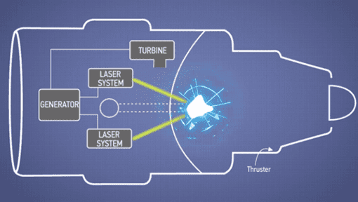 Идея Boeing состоит в применении лазеров, которые будут воздействовать на материал с повышенным содержанием изотопов. Возгоняя его и инициируя в парообразной среде ядерные минивзрывы, планируется получать интенсивный поток нейтронов, направленный выброс которых будет приводить самолет в движение. Компания Boeing уже получила патент на эту технологию.