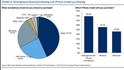43,3% покупателей утвердительно ответили, что выберут смартфон Apple. 24% покупателей еще не определились в этом вопросе. О будущем выборе какой-нибудь модели Samsung высказались 23,4% покупателей. На покупку аппарата BlackBerry рассчитывают только 0,5% опрошенных. Впрочем, не сильно впереди Nokia (1,1%), HTC (1,5%), Motorola (2,8%).