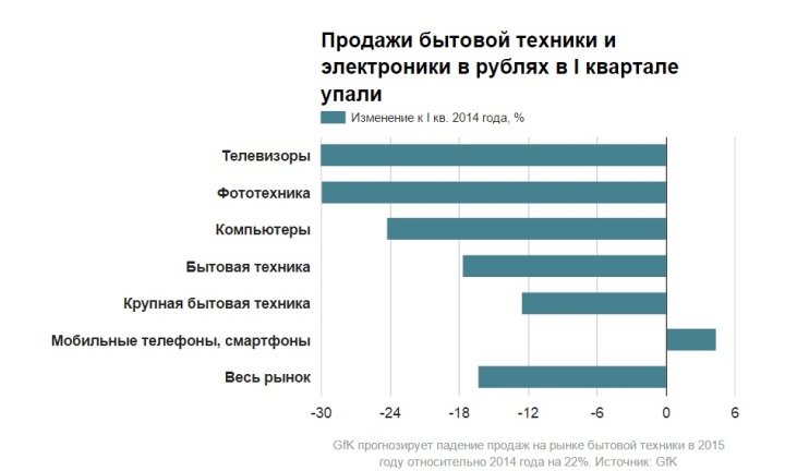 Так что, для начала взглянем на состояние рынка бытовой электроники в первом квартале 2015 года. Взглянем, и испустим горестный вздох – «за первый квартал 2015-го реализация год к году сократилась только на 16,4% в рублях и почти на 50% — в штуках».То есть, за первые три месяца, наши соотечественники получили во владение в половину меньше различных электронных устройств – понятное дело, цифровых – зато заплатили за них меньше, чем на шестую часть…