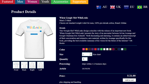 Прежний вид скандально известного сайта Wikileaks, владельцем которого является Джулиан Ассанж, содержал выдержки из опубликованных материалов с разоблачениями и рекламу. Теперь он больше похож на поисковую систему, имеет строку для задания поискового запроса. Реклама фирменных маек Wikileaks, продаваемых по цене $21, сохранилась и в новой версии сайта.