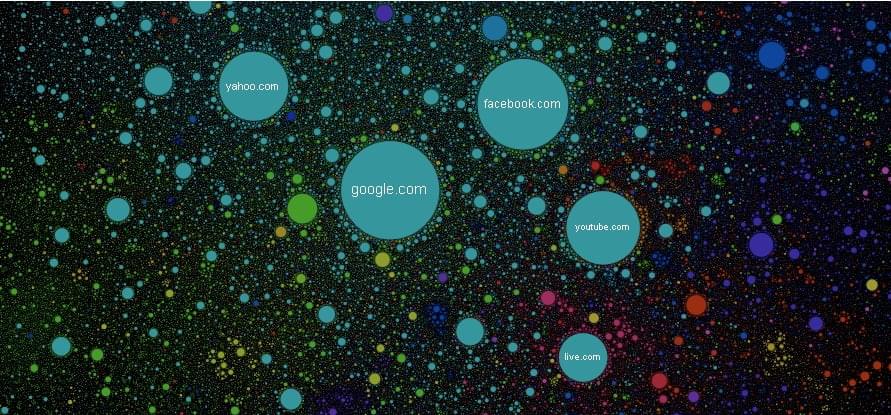 Размер каждого кружочка-сайта зависит от его посещаемости, а расположение сайтов напрямую зависит от того, как люди перемещаются между ними. Данные взяты из рейтинга Alexa.