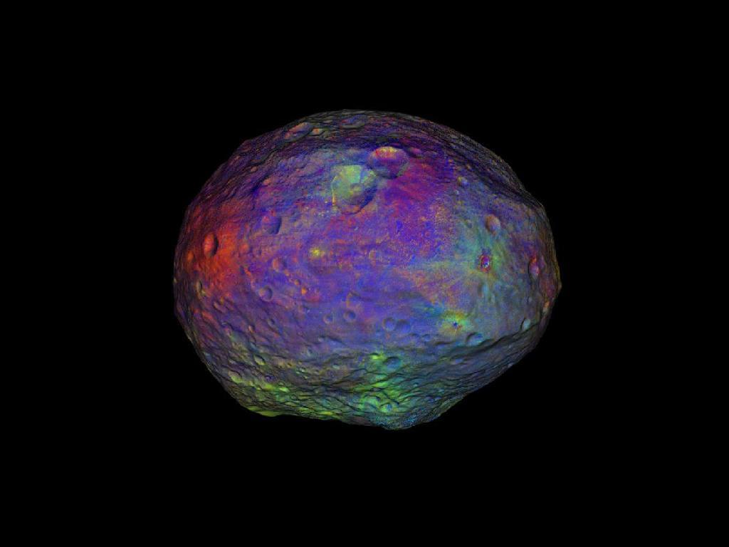 Из-за своего расположения и относительно высокой отражательной способности Веста – единственный астероид, который можно увидеть невооружённым глазом с поверхности Земли. Теперь, благодаря инициативе NASA, мы можем наблюдать его во всей красе. Из отдельных снимков с условным цветовым обозначением составлено покадровое видео.