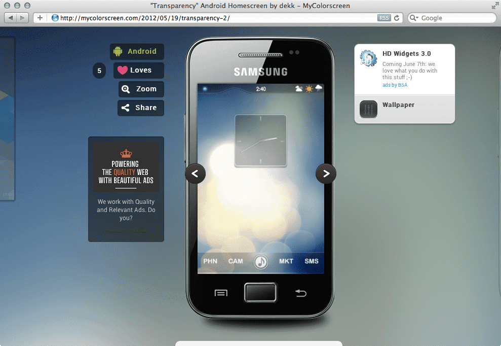 В отличие от iPhone, обживание которого сводится к установке программ и расстановке их на домашнем экране, а также смене обоев, на Android любитель украшать и настраивать может развернуться по полной программе. Существует несчётное количество модификаций, оболочек и наборов значков, которые в сумме могут дать интересный и подчас очень симпатичный результат. Сайт Mycolorscreen напоминает картинную галерею, где в качестве художников выступают пользователи. Они делятся друг с другом скриншотами со своих телефонов и рассказывают, какие программы были использованы. Замечательное исполнение самого сайта отлично помогает настроиться на занятие благоустройством.