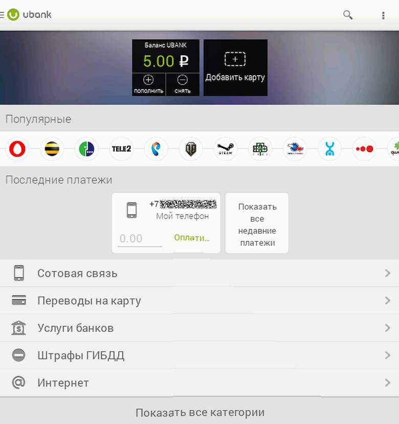 – сквозной режим платежей с выбранной карты, при котором uBank выступает в роли посредника (как PayPal). Основные виды услуг (оплата счетов ЖКХ, за интернет и мобильную связь) предоставляются без комиссии;