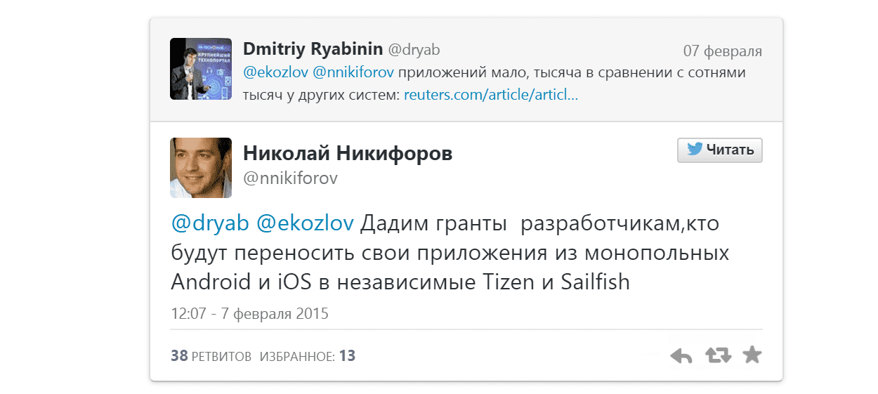 разработанную бывшими сотрудниками Nokia, и Tizen от Samsung. Это не официальное заявление, а один из твитов в ходе конференции PostgreSQL. Это дает надежду на уход от монополии якобы открытой ОС Android от Google или iOS. Также министр связи пообещал скорую массовую продажу смартфонов на Tizen в России.