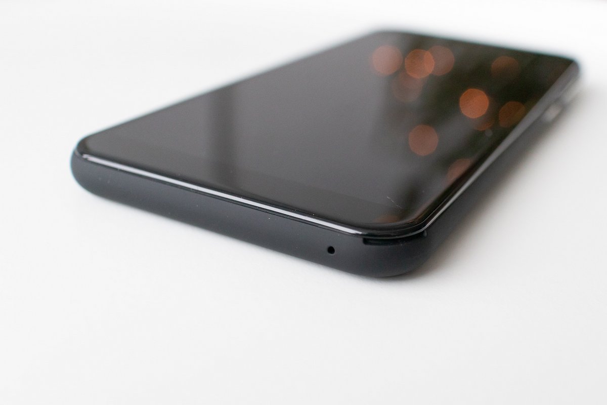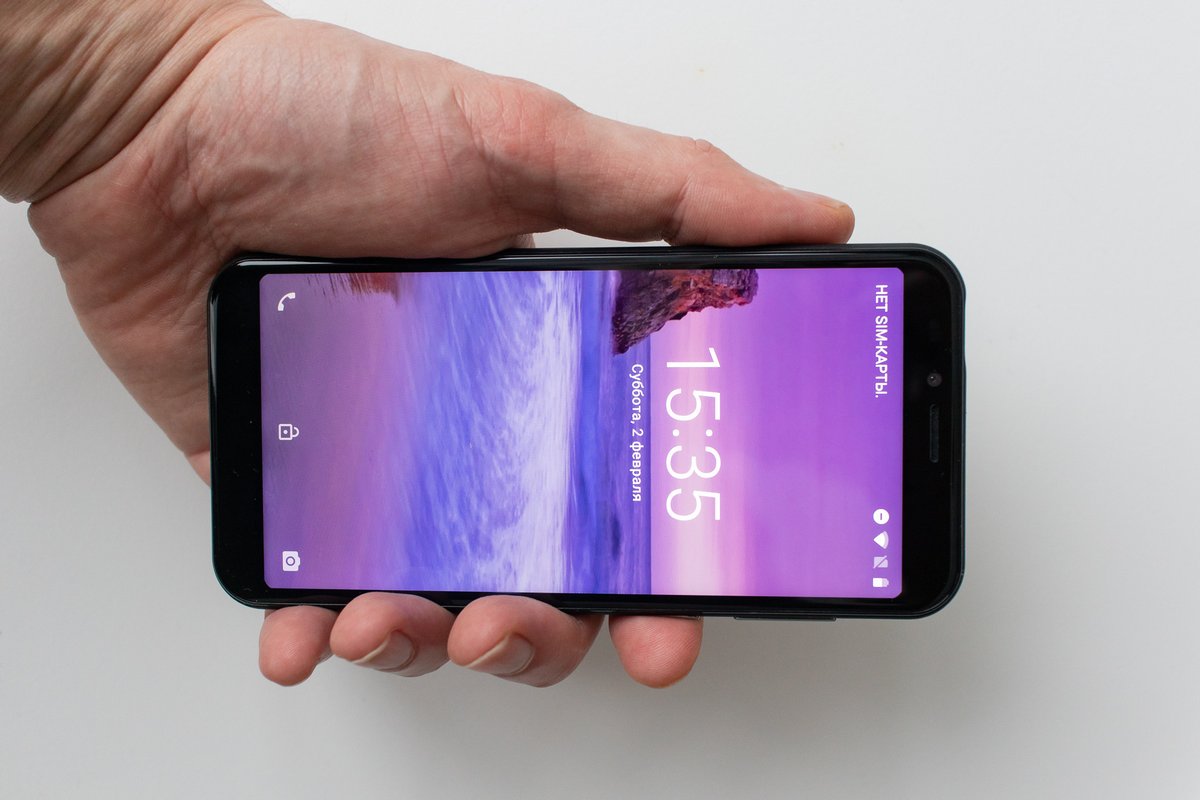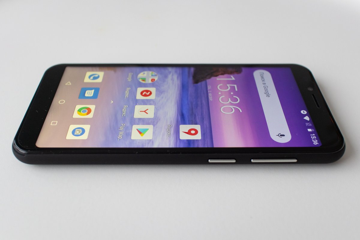Смартфон имеет современные вытянутые пропорции за счет экрана с соотношение сторон 18:9 и довольно больших отступов сверху и снизу. Корпус толстый, но камера выступает еще примерно на 1 мм и будет собирать царапины. Над экраном расположены динамик, глазок фронтальной камеры и датчик света. На нижнем отступе могли быть размещены кнопки управления, но производитель не стал этого делать, кнопки занимают полезную область экрана.