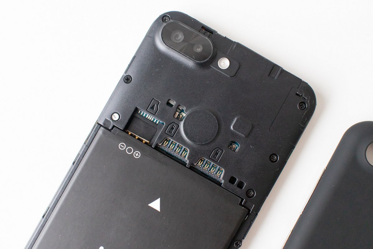 Открыв смартфон можно получить доступ к съемному аккумулятору емкостью 2850 mAh, двум слотам для micro-SIM и micro-SD карте. Такой набор разъемов позволяет одновременно использовать и обе SIM-карты и карту памяти, что для бюджетного телефона является плюсом, позволяя расширить объем встроенной памяти на дополнительные 64 Гб и использовать разные SIM-карты для звонков и интернета.