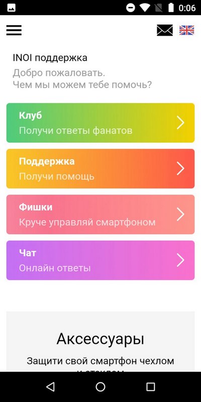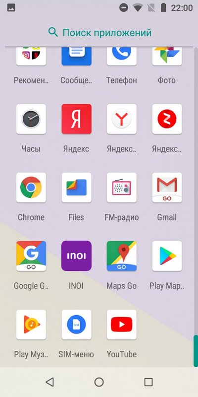Программная платформа INOI 5i – это Android версии 8 Go, эта ОС адаптирована под маломощные устройства с объемом оперативной памяти менее 1Гб. Облегченная версия Android 8.1 Oreo весит в 2 раза меньше, поэтому позволяет бюджетным смартфонам работать стабильно и без зависаний. Фирменной оболочки у смартфона нет, только предустановлены приложения от Яндекс, которые при желании можно удалить. От производителя также установлена одно фирменное приложение INOI для связи с сервисной поддержкой. В приложении можно найти базу знаний о смартфоне, ответы на часто задаваемые вопросы, заказать недостающие аксессуары, узнать, где находится ближайший сервисный центр компании и пообщаться с другими пользователями INOI в онлайн-чате.