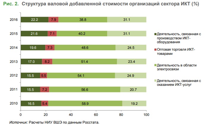 Всего информационная индустрия в 2016 г. составила 3,3% экономики России. Сектор информационно-коммуникационных технологий дал 2,9% ВВП страны. Российский сектор ИКТ в 2016 г. насчитывал 166 тыс. организаций с численностью занятых 1,4 млн. человек, 30% компаний принадлежали федеральным органам госвласти, остальные – частники. Радикальные изменения произошли в структуре сектора ИКТ – с 2010 по 2016 г. доля электросвязи в нем упала с 58,9% до 38,8%, сократившись на треть, а деятельность по оказанию ИКТ-услуг возросла с 19,2% до 31,1%, прибавив в полтора раза. «Телефонисты» неуклонно уступают место «провайдерам», что наглядно видно на графике ниже!
