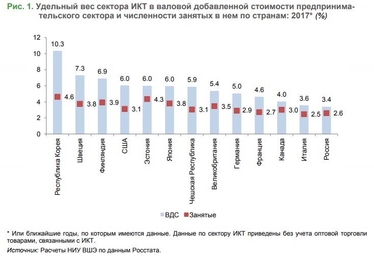 Ну а как соотносится наша доля сектора ИКТ в ВВП страны и общей занятости с ситуацией в других странах? Ответ на этот вопрос даст график внизу. Как видим, по доле в занятости мы сравнимы с континентальными странами «Старой Европы». Ну а по доле информационной отрасли в ВВП страны мы сравнимы с Италией, вдвое уступаем США и втрое Южной Корее.