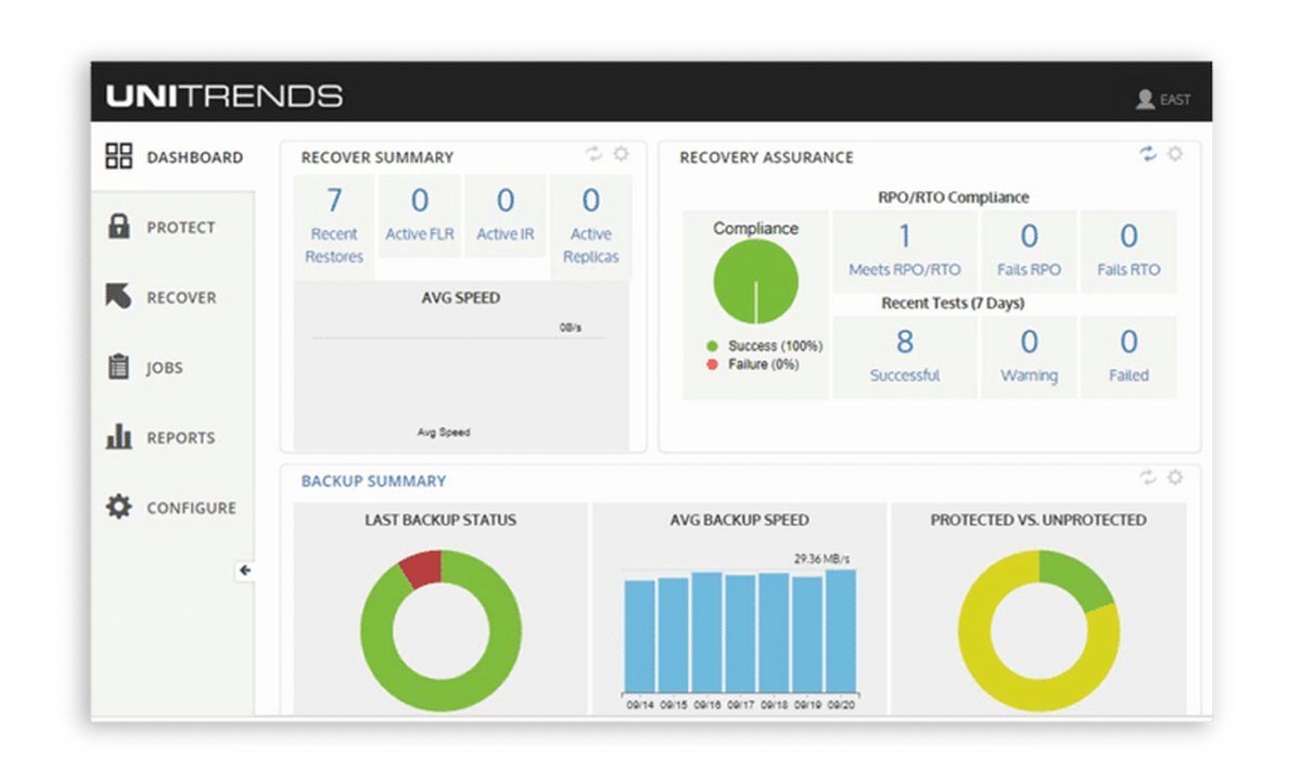 Компания Unitrends — известный производитель систем резервного копирования и восстановления. В ее арсенале есть как программные, так и аппаратные средства для этих задач. Устройства Recovery Series Appliances являются масштабируемыми решениями, которые предлагают пользователям от двух до 120 ТБ дискового пространства для хранения резервных копий. Работают они под управлением ПО Unitrends Backup (но эта программа может работать и без привязки к ним). Система поддерживает работу с физическими и виртуальными средами, обеспечивают бэкап баз данных и бизнес-приложений, обеспечивает интеграцию с облачными сервисами и умеет работать с репликами Windows и VMware. Также в ней есть защита от вирусов-вымогателей и шифрование хранящихся данных при помощи 256-битного протокола AES.