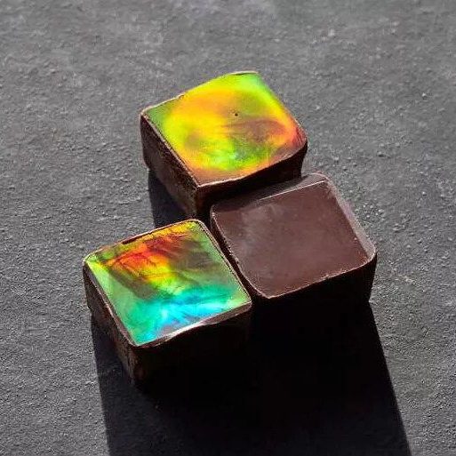 Исследователи из швейцарского университета ETH Zurich сделали шоколад переливающийся радужными цветами без добавления красителей. Они поместили на поверхности шоколада специальную структуру, чтобы придать ему цветовой эффект, как у хамелеона.