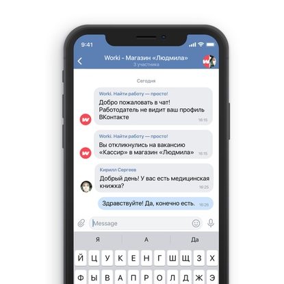 Для продолжения переписки участник беседы должен будет подтвердить, что согласен переписываться в личных сообщениях «ВКонтакте». Для кандидата собеседование будет выглядеть как диалог, в котором работодатель общается от имени Worki, а для нанимателей будет создаваться отдельная беседа.