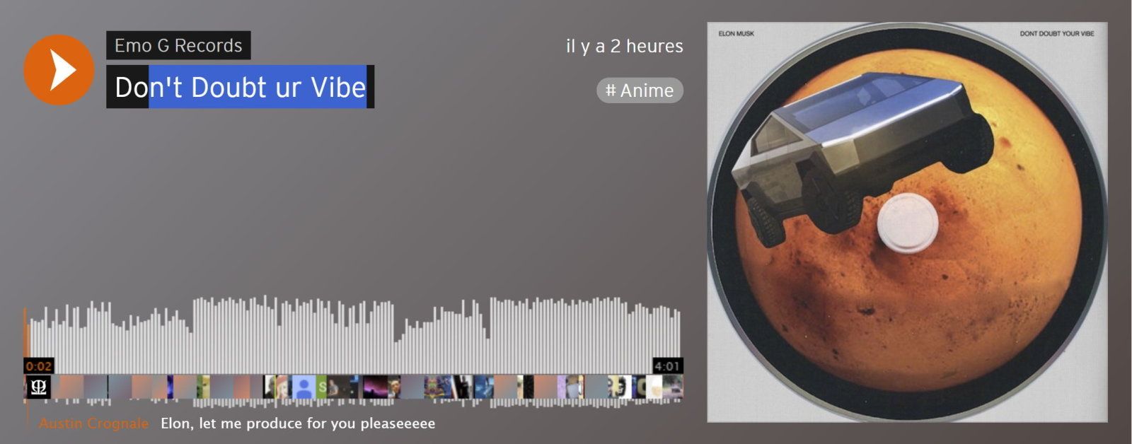 Предприниматель сообщил в Twitter, что написал свой текст и сделал запись голоса. Также он выложил фотографии из студии. «Вайб» у трека явно мотивационный: в композиции повторяются фразы Don’t doubt your vibe («Не сомневайся в своих эмоциях») Because it’s true («Потому что это правда»).