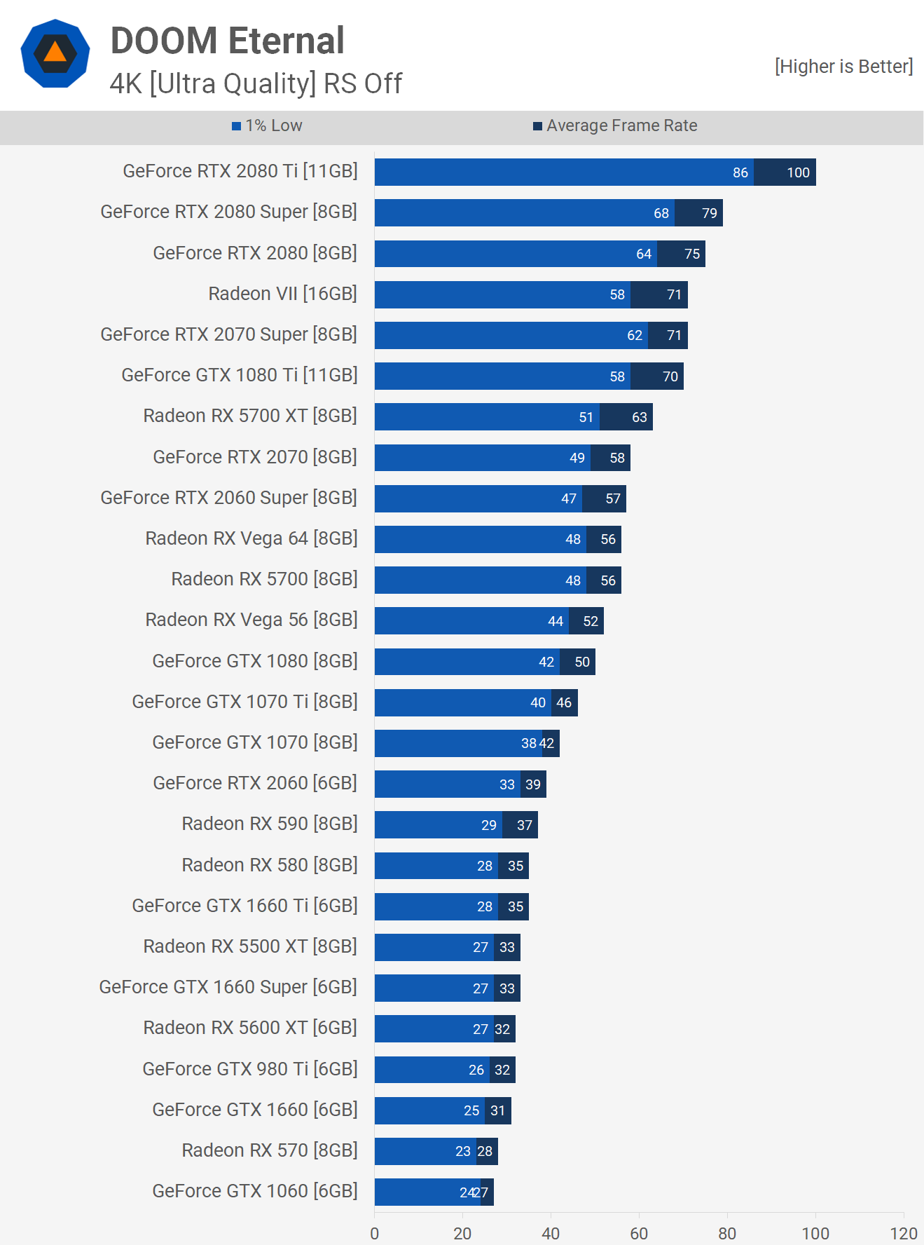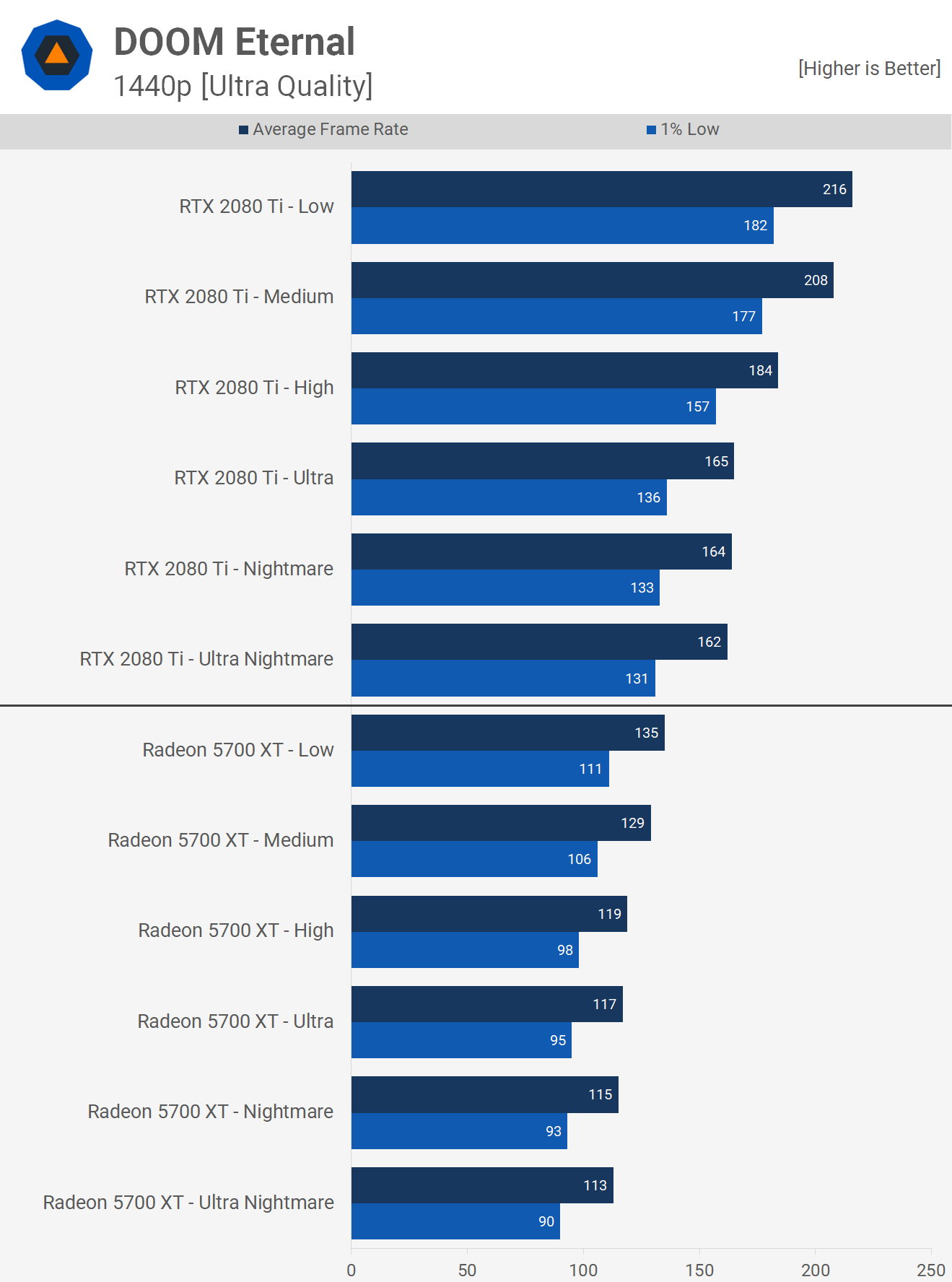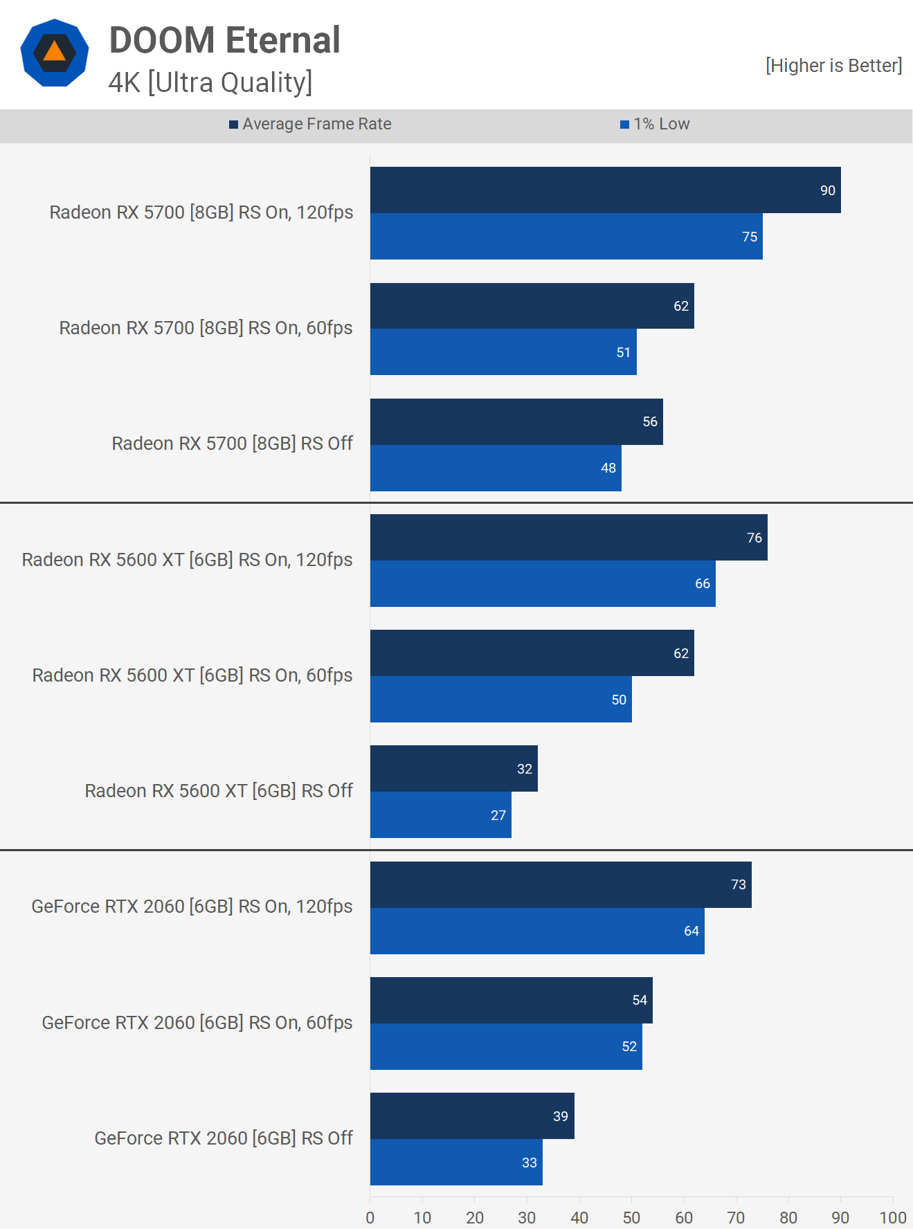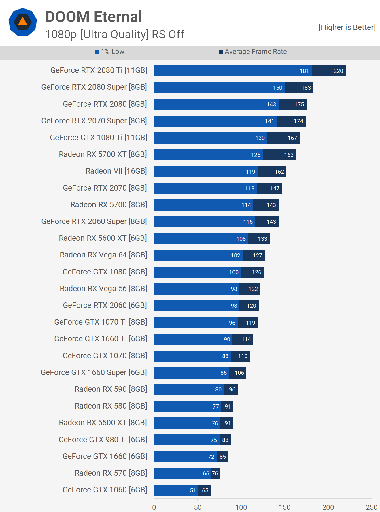 Так работают нынешние поколения графических процессоров в Doom Eternal, по крайней мере, с 6ГБ видеопамяти или более. Для тех, кто играет с GTX 1060 или с аналогичной производительностью, цель этого теста — дать вам представление о том, что нужно обновить, чтобы повысить производительность на желаемую величину, будь то повышение 30%, 40% или больше.