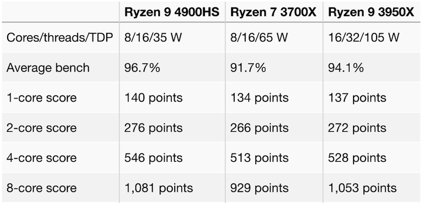 Мобильный процессор набрал 1081 балл по итогу общего тестирования, в то время как его оппоненты – немного меньше. У Ryzen 9 3950X – 1053 балла, а у Ryzen 9 3950X – всего 929.