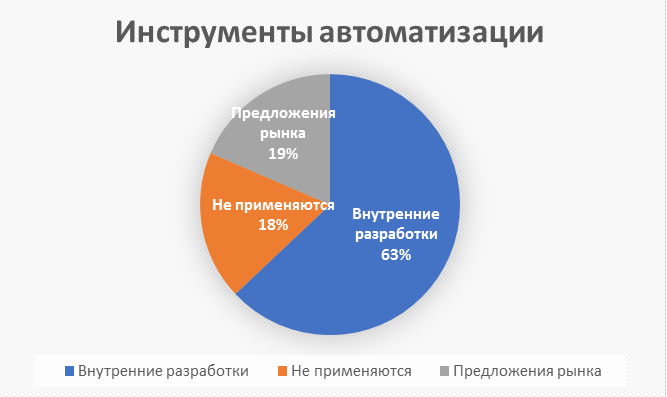 Выяснилось, что инструменты автоматизации вообще не применяются только у 18% российских компаний. 19% используют предложения, доступные на рынке прикладного ПО (в основном это ERP-системы вроде 1С и SAP), а 63% — собственные разработки.