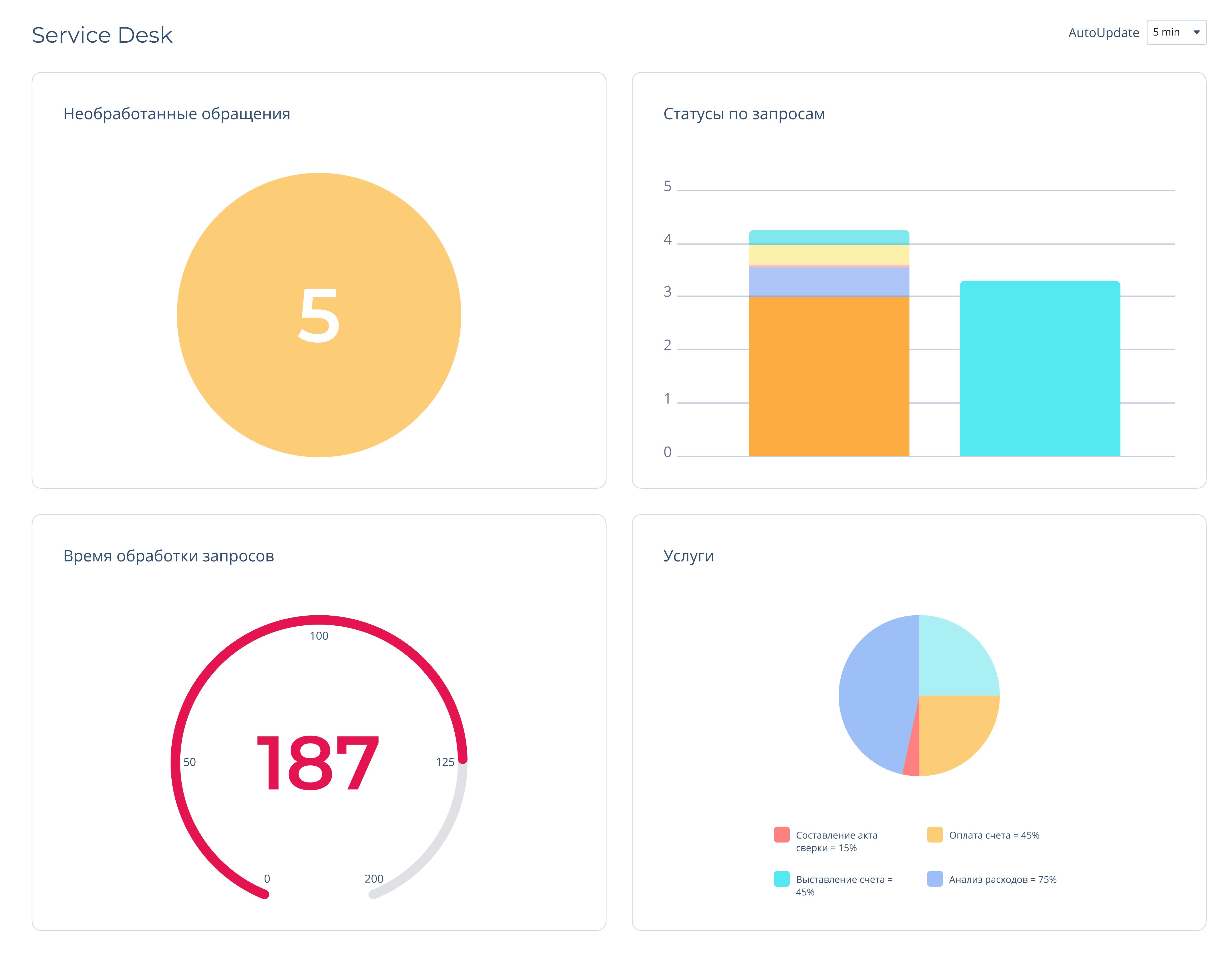 Благодаря настраиваемым отчётам и дашбордам руководители могут получать наглядные отчёты по работе своих сотрудников, а сотрудники могут отслеживать статистику по заявкам и не терять их. Подобная функциональность обеспечивает прозрачность работы, что имеет большое значение для повышения качества обслуживания пользователей.