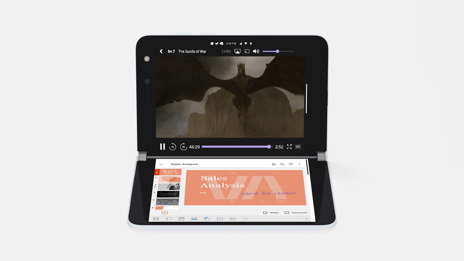 Для корректного запуска приложений на двух экранах сразу, смартфон использует «умные» алгоритмы, которые анализируют действия пользователя. Например, если на одном экране у вас открыта мобильная почта и вы нажмете на ссылку в письме, она откроется на втором дисплее, чтобы вы продолжали видеть текст письма рядом с веб-страницей. Приложения Microsoft Teams, PowerPoint, пакет Office и OneDrive были также оптимизированы под двойной экран, и даже Amazon подстроил приложение Kindle под новый формат: каждая сторона книги открывается на соответствующей половине дисплея.
