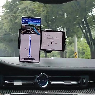 На видео водитель использует большой экран для GPS-навигации, а на втором экране запущен плеер. Размер второго экрана составляет примерно половину размера основного дисплея. Затем, когда поступает телефонный звонок, он отображается на меньшем дисплее, не прерывая работу навигационного приложения.