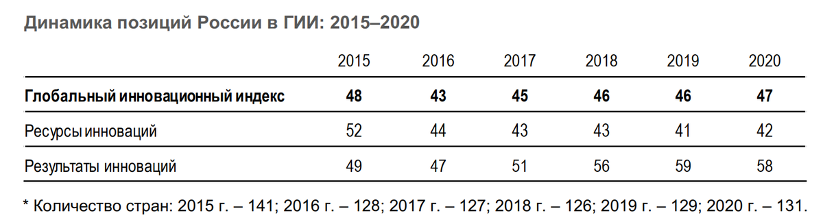 В рейтинге ГИИ Россия начала терять позиции с 2017 года. Для сравнения, в 2016 году страна занимала 43 строчку, но уже в следующем году опустилась на 45. В прошлом году Россия занимала 46-е место. При этом в период с 2013 по 2016 год позиции России значительно улучшились, поднявшись с 62-го на 43-е место. Таким образом, 2016 год стал самым успешным для страны в плане развития инноваций, науки и образования.