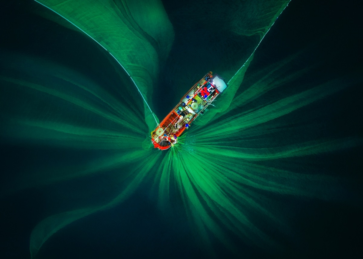 Среди других запоминающихся лауреатов — снимок рассерженной чайки, которая целится в дрон; фотография момента, когда серый кит осторожно продвигается под лодкой с туристами; и фотография рыболовных сетей, которые формирую красивый цветочный узор на воде.