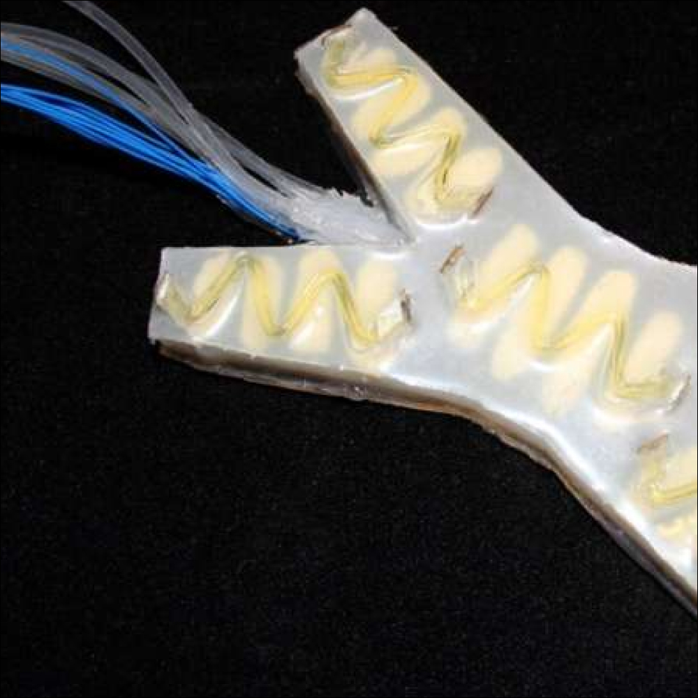 Свое решение этой задачи предложили инженеры Корнельского университета. Они предложили использовать в мягких роботах растягивающиеся волоконно-оптические датчики, способные обнаружить мельчайшие изменения на поверхности робота. При этом все эти датчики объединены с полиуретановым эластомером, включающим в себя водородные связи для быстрого заживления оболочки.