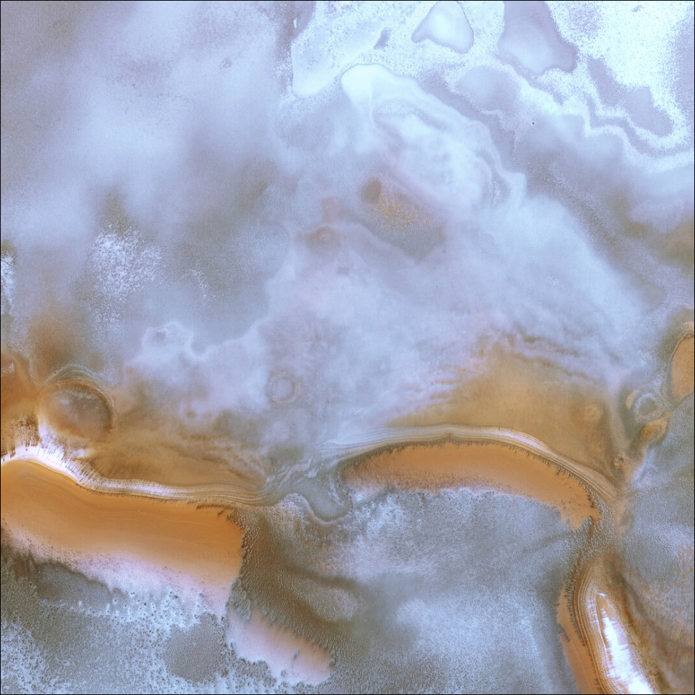 Темные пятна на кратерах образуются из-за углекислого газа. Он прорывается сквозь лед, выбрасывая фонтан пыли, оседающей в виде круглых пятен. Высвобождение газа весной повышает давление на планете и вызывает сильные ветра. Таким образом на Марсе весь год идет обмен веществ.