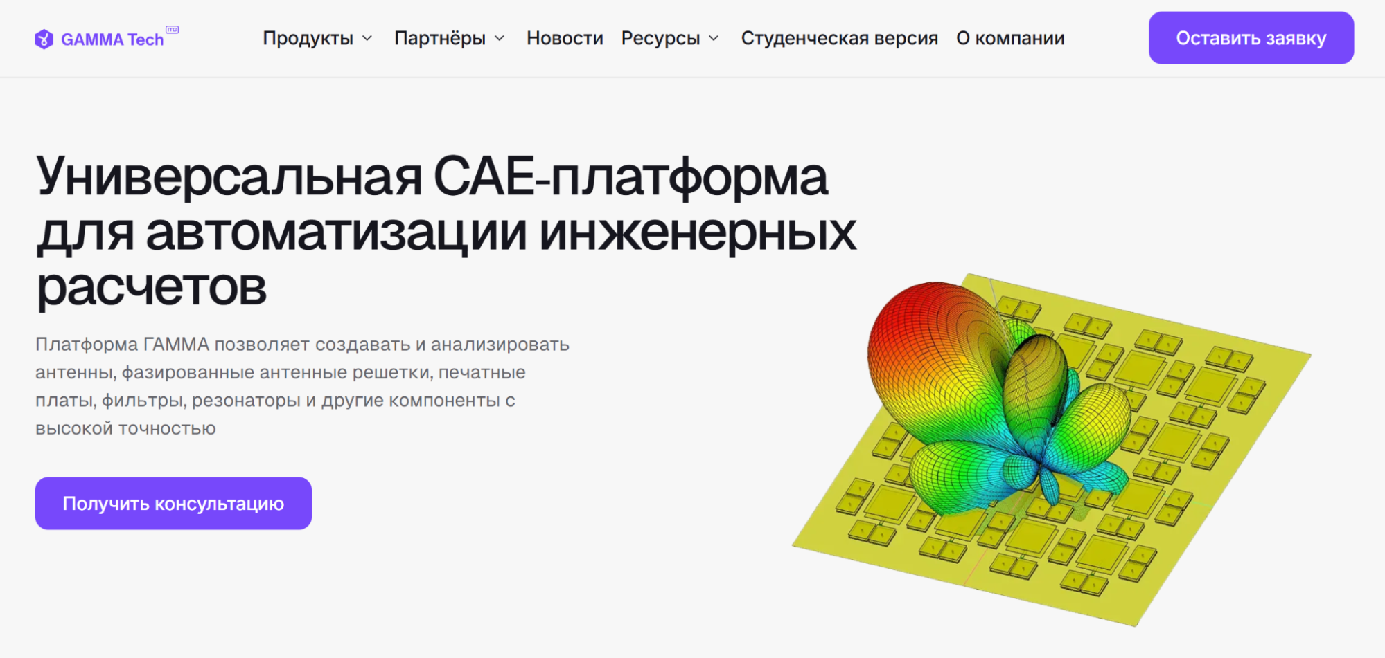 «ГАММА» — универсальная CAE-платформа для моделирования радиоэлектроники и СВЧ-устройств. Применяется в телекоммуникациях, радиотехнике, судостроении, авиакосмической промышленности и научных исследованиях для анализа антенн, печатных плат, волноводных устройств, резонаторов и ферритовых устройств.