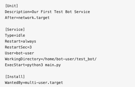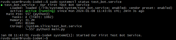Можно было бы остановиться на дальнейших настройках, ведь бот успешно запустился и работает. Но что произойдет если вдруг, наш VPS перезагрузится? Бот просто выключится и перестанет работать. Для его запуска вновь потребуется подключиться к серверу и вручную запустить его. Но этого можно избежать, настроив автоматический запуск при запуске системы.
