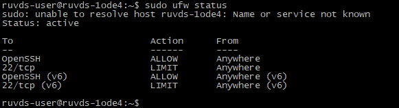 Повторно подключаемся по SSH, указав в качестве пользователя ruvds-user: