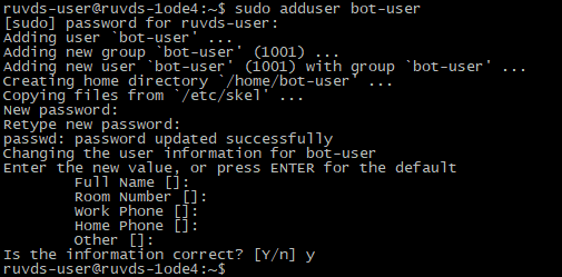 Для обеспечения безопасности сервера создадим еще одного пользователя, через которого и будет работать Telegram-бот. Так как у данного пользователя будут ограниченные права, учетные данные от него можно смело предоставить специалисту, который будет заниматься настройкой бота.