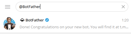 Теперь приступим к регистрации бота в Telegram. Для этого открываем мессенджер и в строке поиска вводим @BotFather.