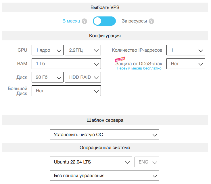 Далее выбираем параметры сервера. Для Telegram-бота хватит сервера с минимальной конфигурацией. В качестве операционной системы выберем Ubuntu 22.04 LTS.