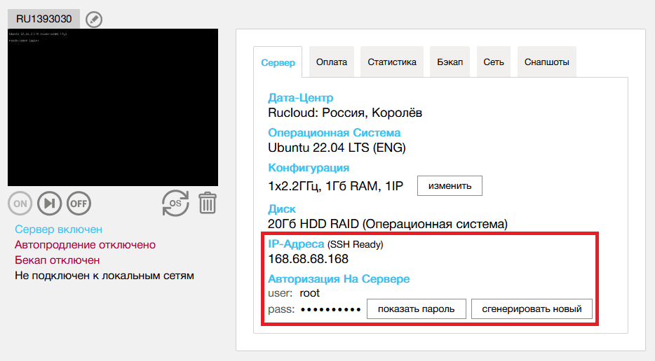 Оплачиваем сервер, дожидаемся завершения установки и переходим во вкладку «Мои серверы». Здесь можно увидеть данные для подключения к нему. В случае с Linux подключение будет происходить через SSH под пользователем root.