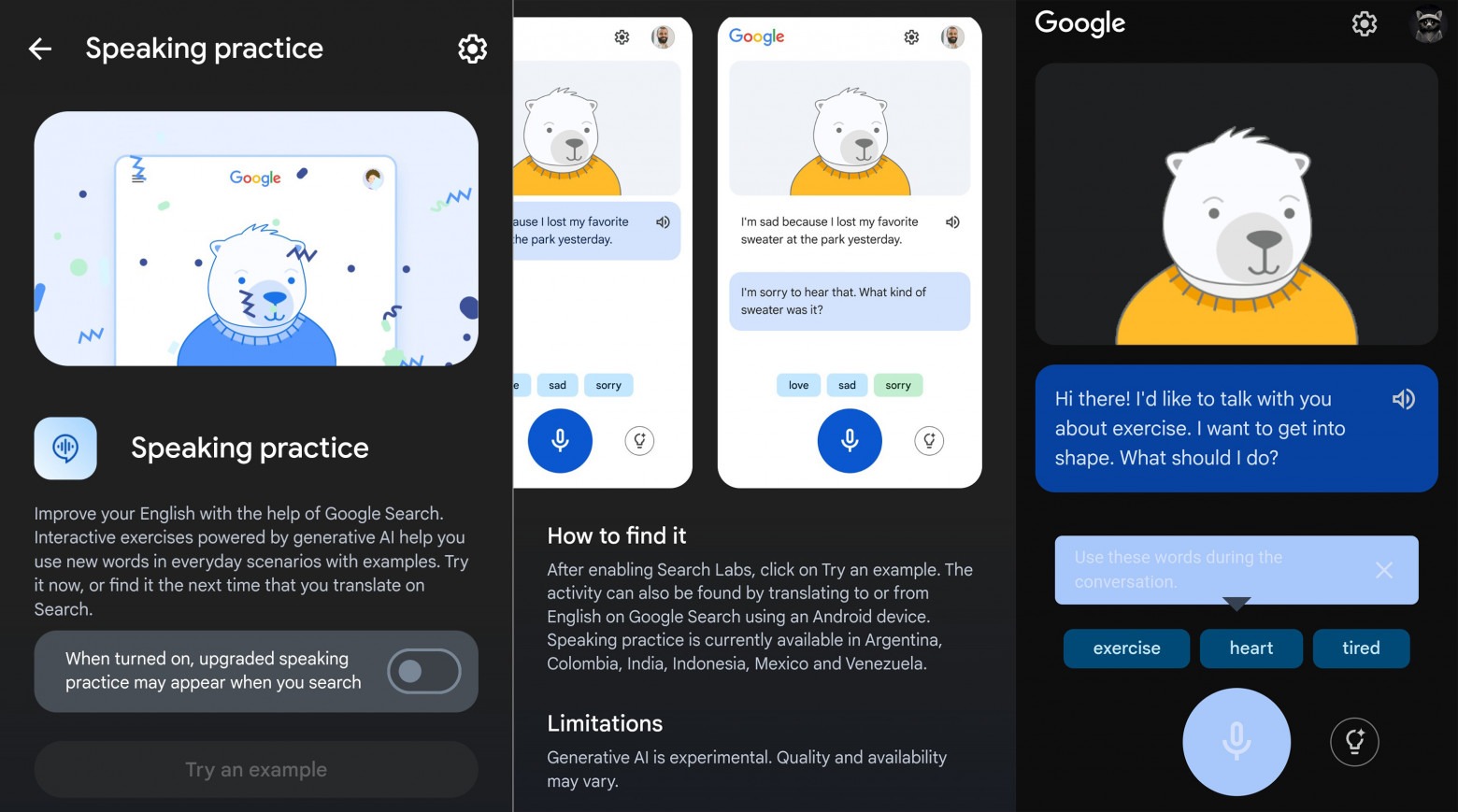 Google открыла тестовый доступ к Speaking practice, функции, нацеленной на улучшение произношения разговорных английских фраз. В настоящее время ее могут использовать только участники Search Labs — программы, которая открывает возможности использования ИИ в Google Search.