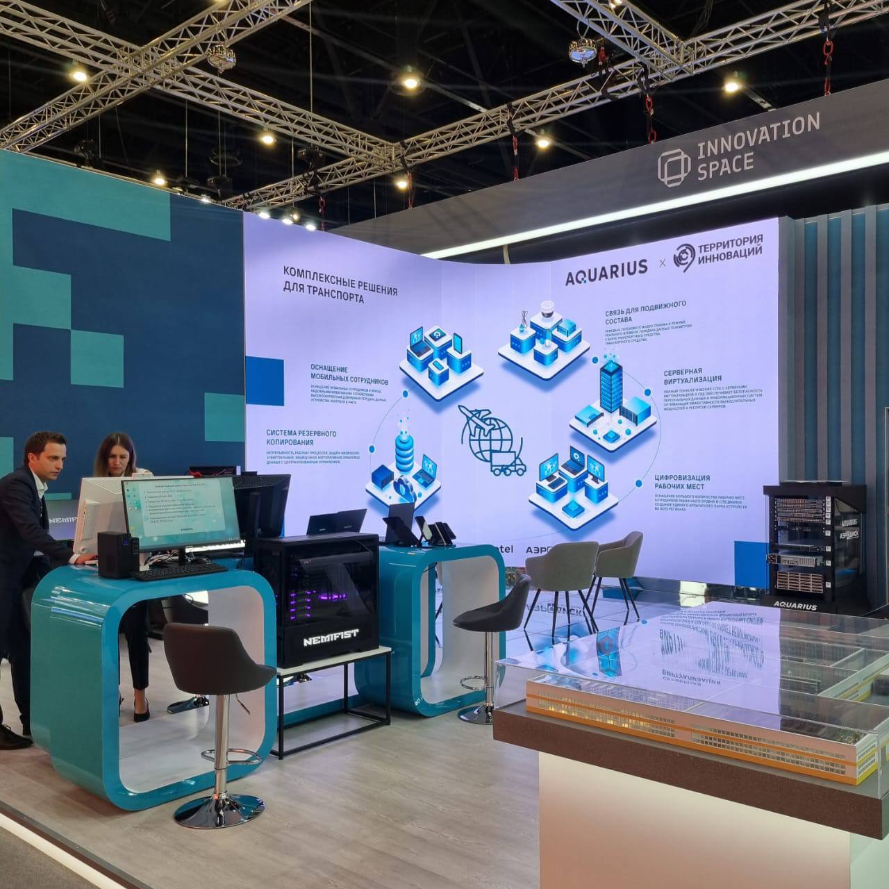 На стенде ГК «Аквариус» представлены персональные компьютеры Nemifist за 1,3 млн руб., устройства Aquarius, интерактивная панель и макет производственного комплекса «Аквариус» в Шуе для демонстрации масштабов производства.
