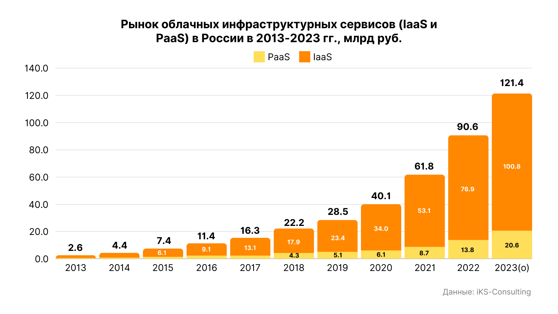 По итогам 2022 года объем российского рынка облачных сервисов достиг 86,6 млрд рублей, что на 42% больше, чем в 2021 году. В 2023 году рынок продолжил расти: объем составил 121 млрд рублей. Согласно прогнозам, в 2024 году российский рынок облачных сервисов вырастет на треть, и до 2026 года рынок инфраструктурных проектов будет прибавлять в среднем по 23,2% ежегодно.