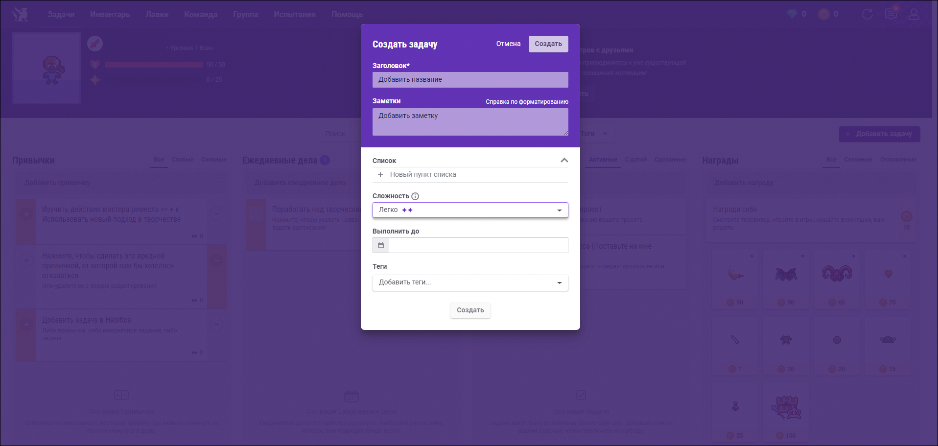 Система выделяется на фоне других бизнес-приложений. Habitica базируется на геймификации. Интерфейс, отслеживание прогресса, постановка задач здесь приближены к компьютерной или настольной игре. По мере выполнения дел, пользователю начисляется опыт, а за просрочку дедлайна отнимается здоровье. Однако по сути сервис представляет собой канбан-доску.