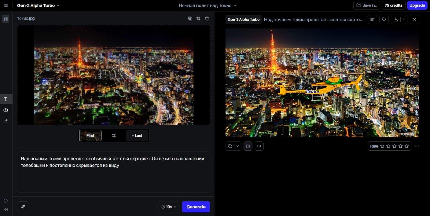 Промт: «Камера пролетает над ночным Токио. Она летит в направлении телебашни».