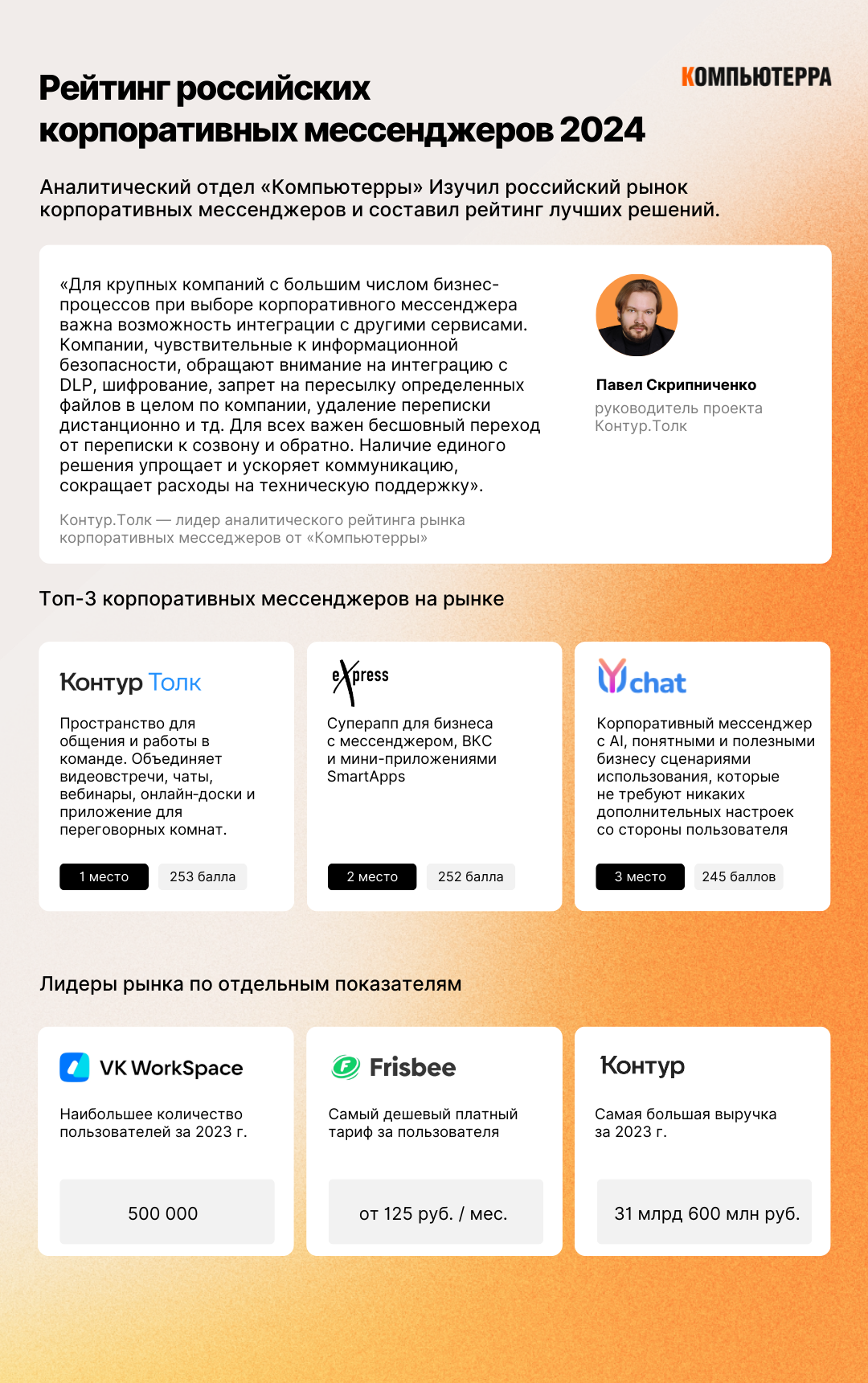 Лидером рейтинга российских корпоративных мессенджеров стала платформа «Чаты в Контур.Толке» от продукта Контур.Толк, набрав 253 балла.