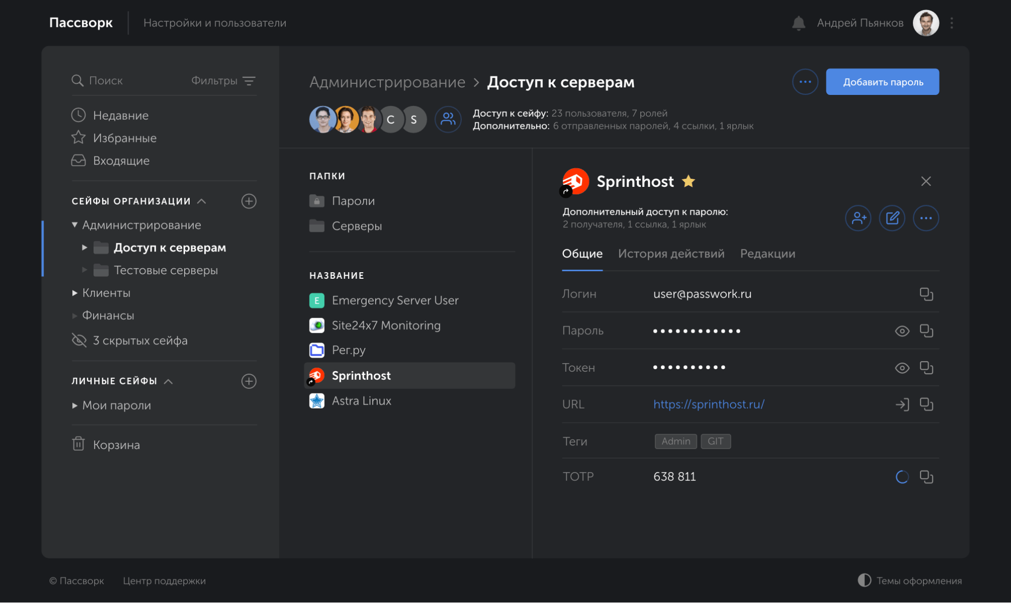Пассворк может устанавливаться на сервер вашей компании и хранит все данные в зашифрованном виде — они никогда не передаются в облако, что гарантирует их защиту от несанкционированного доступа. Система позволяет быстро и удобно делиться паролями внутри команды, что значительно упрощает совместную работу.