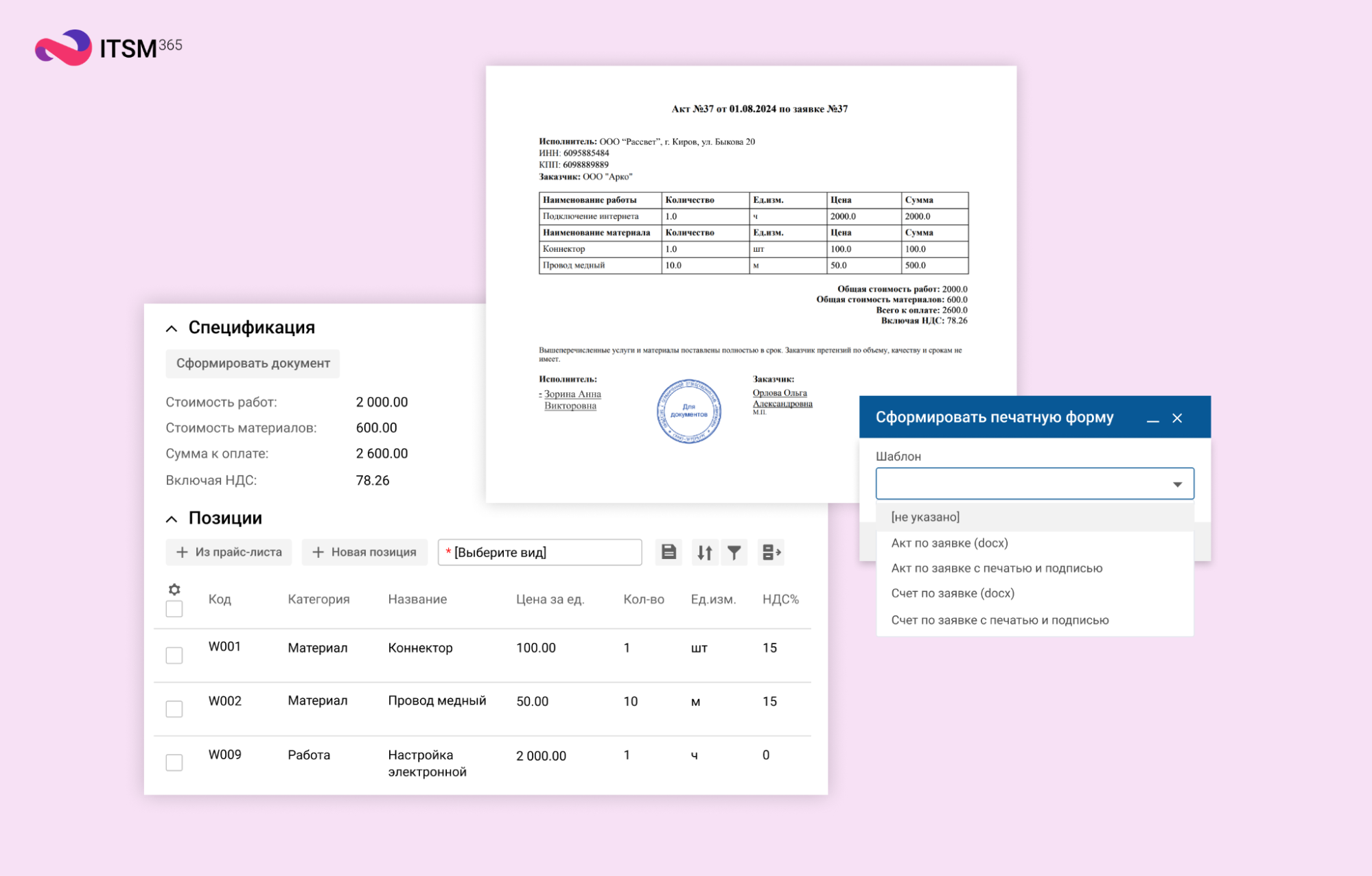 Кроме того, при активации модуля печатных форм, пользователи могут прямо из системы распечатывать любые документы, в том числе с подписью и печатью компании.